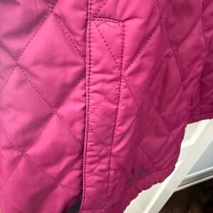 Columbia quilted jacket in deep red. Features zippered chest pocket and warm design.