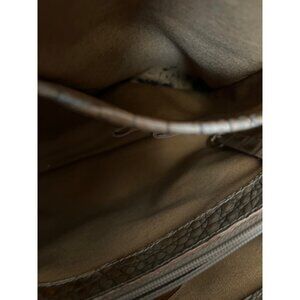 Minor wear on leather edges and interior lining. Approximate dimensions: Width = 12", Height = 10", Depth = 5".