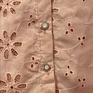 Charming pink blouse with floral eyelet design. Button-up front. Long sleeves with cuffs. Perfect for casual or dressy occasions.