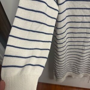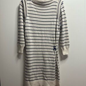 Chic long sleeve dress with navy stripes. Soft cream base. Ideal for versatile styling.