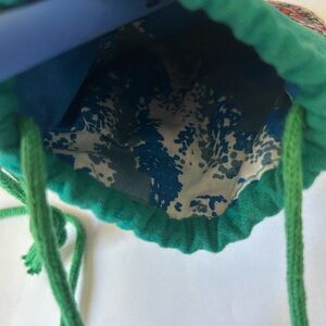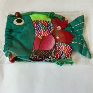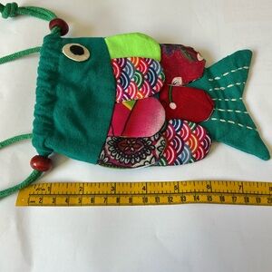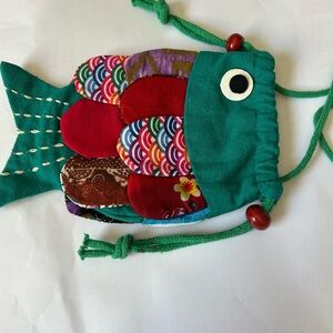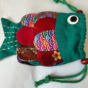 This handmade fabric fish-shaped crossbody bag is a stylish and unique accessory perfect for women who love creative and eye-catching pieces. The bag features a multicolor exterior made of a cotton blend material with a fabric lining, providing a durable and comfortable interior. The fish-shaped design adds a playful touch to any outfit, making it a fun and fashionable addition to your wardrobe. Perfect for carrying daily essentials with ease and flair. pre owned in great condition measurements are approximately 5”L X 6”H strap measure approx. 46”and bad drop is approx. 23” please see pictures