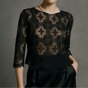 Vintage Ursula of Switzerland nude crop top with black lace overlay. Very modern design considering this top is from the 80s. With mini shoulder pads and wide boat neck. Three quarter length sleeves.
