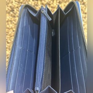 Zip-around closure runs smoothly, multiple card slots, and compartments are clean with minimal visible scratches.
