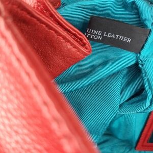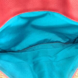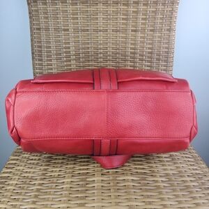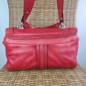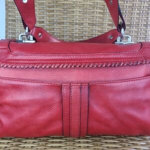Oryany red pebbled leather shoulder bag, satchel, purse, handbag. Blue soft inner lining. Silver toned hardware. The main compartment has an envelope fold-over closure with a twist clasp. There are multiple pockets inside, including, three zip closure pockets with leather pulls and two slip pockets. The exterior includes one large slip pocket on the backside with a magnetic snap button closure. This bag includes snap button closure on both sides of bag for more room. There is normal wear evident. There is rubbing on the woven leather strand on the front side of the bag. Please see all photos.