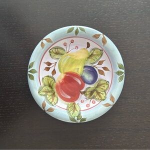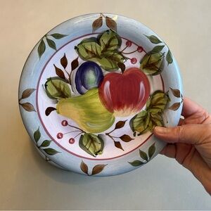 Hand Painted rustic style design with an Apple, pear, and plum in the center surrounded by a light blue rim with green leaves.
