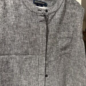 Vintage dark grey, ‘Pendleton’ two piece linen suit set. Medium tank top button up top and Large pants. The set is in excellent condition with no rips, holes, tears, or stains.