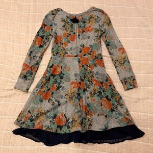 Beautiful long sleeve fit & flare dress with an allover floral print in warm fall tones. Features a soft heathered gray background with orange, teal, and green florals. The skirt has a flowy silhouette with a sheer black chiffon hem for added movement and feminine detail.