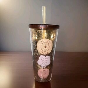 This is a brand new, unused, Disney Winnie The Pooh And Friends Drink Tumbler With Straw (And Glitter speckles inside the cup itself , Very cool!)