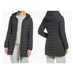 Boasting a cozy adjustable hood, this down-filled puffer jacket is a smart way to stay cozy—and chic—when temperatures dip.