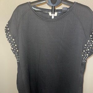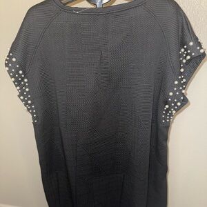 Chic black top with geometric texture. Pearl accents on sleeves. Perfect for stylish looks.
