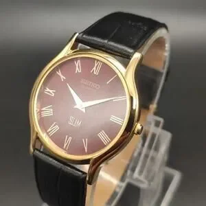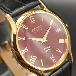 Vintage Style Seiko Quartz Mens Gold Watch & Red accents W/Leather Strap