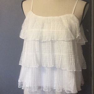 *NEW*Stunning white ruffle layer top has lots of detail with the white polka dots on the sheer mesh overlay, the thin velvet/ribbon straps, the white sheen underlining & the pretty neckline