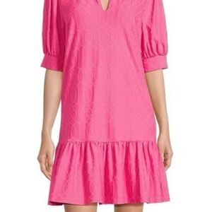 This dress features a vibrant pink color with a subtle textured pattern, giving it depth and a refined look. Designed in a relaxed shift silhouette, it offers effortless comfort while remaining polished. The short puff sleeves, notched collar neckline, and tiered ruffle hem add feminine structure and movement.