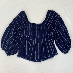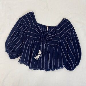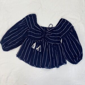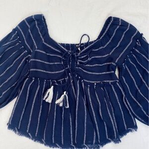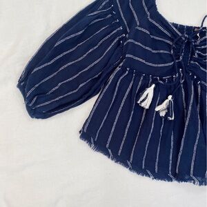 Chic navy striped top with a stylish tassel detail. Perfect for casual outings.