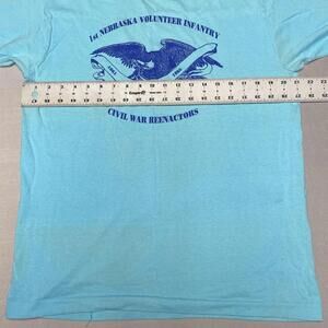 Vintage style men's T-shirt featuring a bold graphic print of the 1st Nebraska Volunteer Infantry Civil War reenactors. This turquoise shirt is made from a comfortable 50% cotton and 50% polyester blend, providing a soft feel with durability. It is a vintage XL, more of a modern mediumf and crafted by Screen Stars Best, made in the USA. The shirt offers a classic fit with short sleeves and a crew neckline, perfect for casual wear or reenactment events.