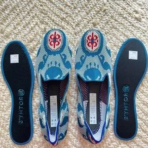 Elegant flats with a teal and white pattern. Comfortable and stylish for everyday wear.