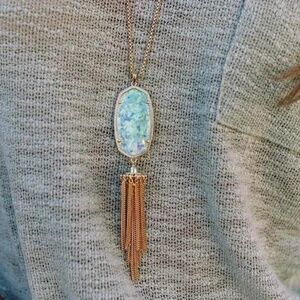 Kendra Scott Rayne long gold-tone necklace featuring a mint opalescent stone with beautiful multicolor shimmer and signature chain tassel detail.