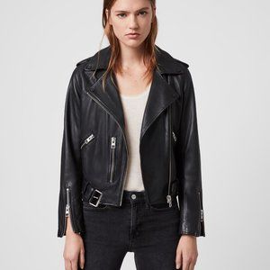 Sleek black leather jacket. Features silver zippers and buckle. Classic biker style. Great Condition