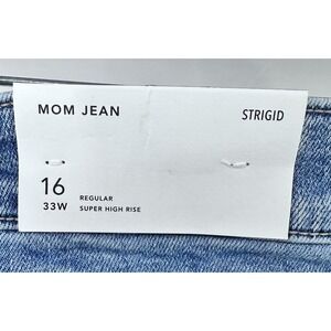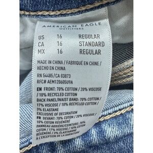 The product is a pair of American Eagle women's Mom jeans in size 16 regular. These jeans are made from a sturdy denim fabric with a high-rise waist and a 5-pocket design. They feature a distressed look with accents like buttons and zippers, and have a comfortable stretch fit. Perfect for all seasons, these solid blue jeans are machine washable and suitable for a variety of casual styles, including bohemian, 90s, and retro looks.