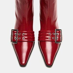 Women's Buckle Red Ankle Boot Kitten Heel Pointed Toe Leather Fashion Dress Boot