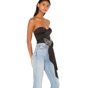 Form-fitting bustier-style satin top featuring an oversized crystal-embellished bow at front. Cascading draped panel at side, contrast silver zipper with O-ring hardware at back.