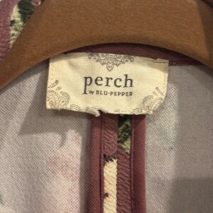 Elegant Blu Pepper blazer with floral design. Soft pink base with cream flowers. Perfect for adding flair to any outfit.