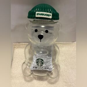 Clear bear-shaped glass with a green hat featuring the Starbucks logo. Perfect for collectors.