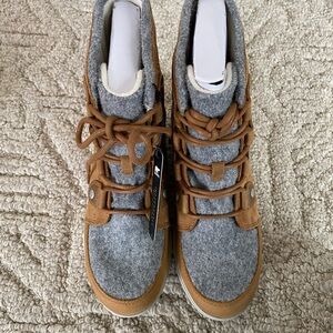 Stylish and cozy boots. Durable brown leather with soft gray accents. Ideal for outdoor fun.