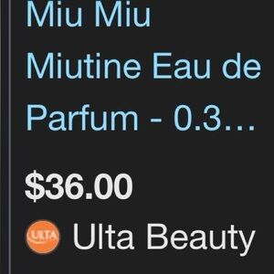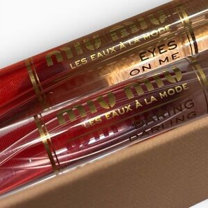 Elegant Miu Miu fragrance set. Includes two travel sprays and a decorative box. Features a bold red ribbon.