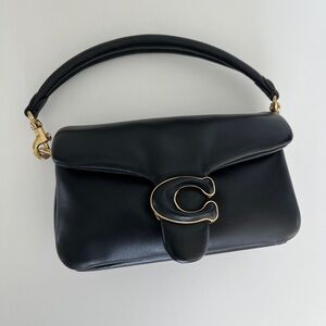 Coach Elegant black leather handbag with gold accents, perfect for any occasion.