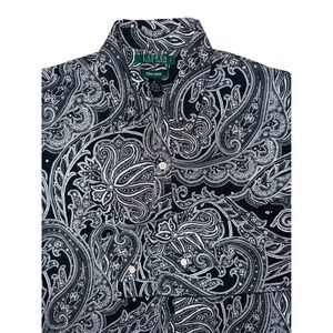 Lauren Ralph Lauren button-up shirt in a striking black and white paisley print. This non-iron style offers a classic collared neckline and long sleeves for effortless wear. The full button front closure and tailored fit make it a versatile addition to any wardrobe.