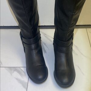 American Eagle black knee-high riding boots with buckle accents.