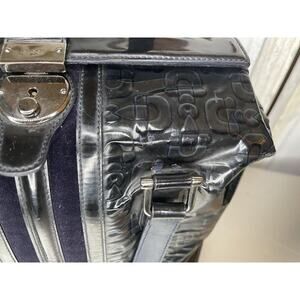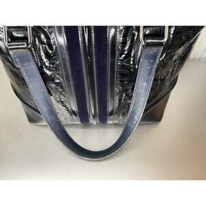 This is the authentic GUCCI Patent Horsebit Embossed Treasure Boston in Black and Blue. This is a stunning tote that is structured of lovely navy blue Guccissima GG patent embossed leather. The bag features black patent leather at the corners and sturdy leather top strap handles. The face of the bag is complimented with blue decorative velvet trimming, a polished brass push lock, and a chain detail that hangs mid-center of the bag adding a bit of flair to the bag. The interior opens to a black fabric interior with a zipper pocket.