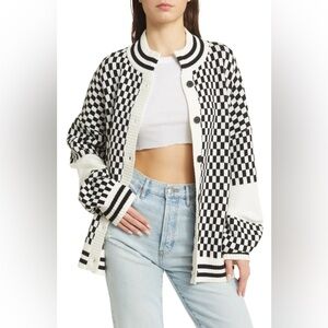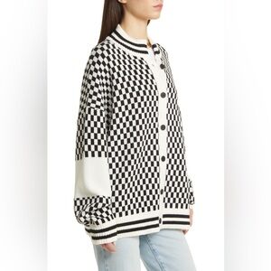 This oversized cardigan is knit with dropped shoulders and a slouchy fit in a very energetic check pattern.