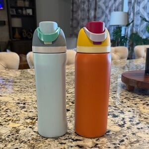 Owala water bottles: one in orange, yellow, and pink. Another in light blue, grey blue, and teal. both cleaned. orangle bottle is 32oz and blue bottle is 24 oz. no big dents or scratches, only small scratches on the very bottom! great condition!!