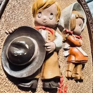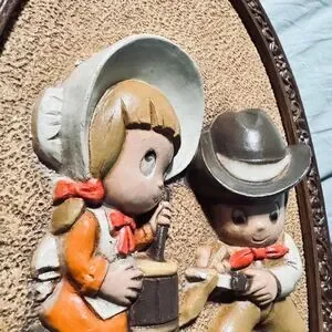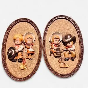 Home decor vintage 1981 3D wall plaque. Cowboy and western children pictures, Homco Hubbell made in USA. This matched pair, oval approximately 14" by 9", feature embossed figures. The boy and girl are like little figurines attached to the burlap, rustic background. Super cool. Super fast shipping next business day!!
