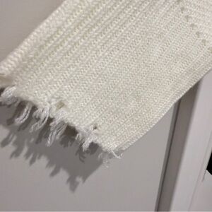 Stylish white open-front cardigan with pom-pom trim. Perfect for layering. Cozy, thick material.