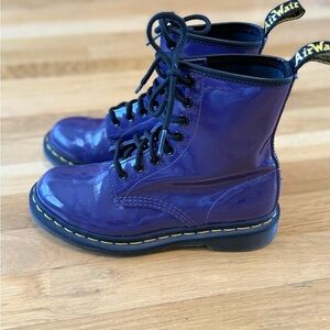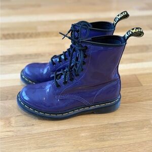 Vibrant purple patent boots by Dr. Martens. Features lace-up style and sturdy sole.