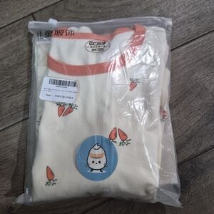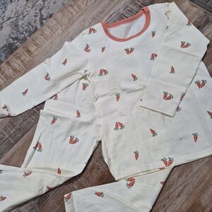 Adorable kids pajamas featuring a playful carrot print. Made from soft, comfortable fabric in a charming cream color. Perfect for a cozy night's sleep.