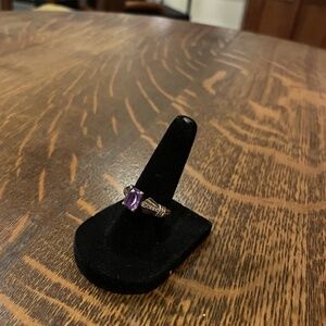 This is a beautiful vintage, 14k stamped amethyst ring with diamond accents. The weight of the ring is 5.69 grams and its size is between size 6 and 6.5, probably around size 6.3. The amethyst is 1.5cm by 1cm.