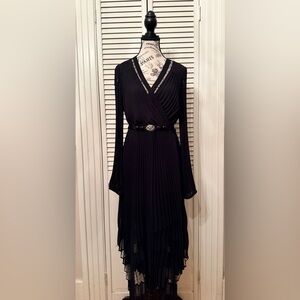 Romantic and chic black dress with a flowing pleated design. Features long sleeves and a stylish belt. Perfect for versatile styling.