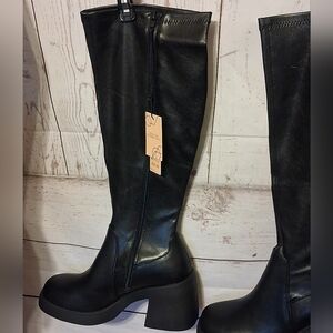 Step out in style with these sleek black vinyl knee-high boots. Perfect for any occasion, they offer both comfort and elegance. Size 9. New in box.