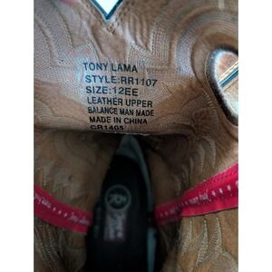 The product is a pair of men's black leather Western cowboy boots by Tony Lama in size 12 EE. These stylish boots feature a traditional cowboy design, with a durable leather upper and outsole, making them perfect for both fashion and functionality. The wide EE width provides added comfort and room for those who may require extra space. Ideal for those looking to make a statement with their footwear, these Tony Lama boots are a classic choice for any cowboy-inspired look.