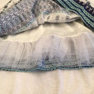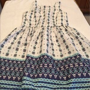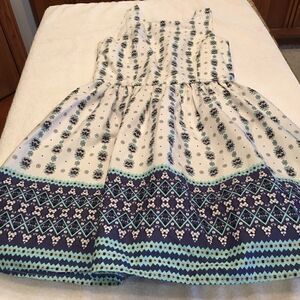 RNB scoop neck tank dress full skirt. White with a blue teal pattern. Slip with tulle bottom. Enclosure at neck with button