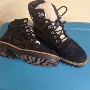 Stylish lace-up boots with cozy white lining. Durable and trendy.