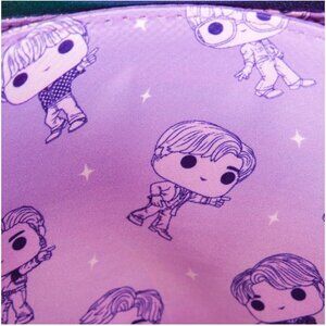 Features: This vegan leather crossbody is artsy and functional, with an adjustable iridescent strap featuring chain detail and gunmetal hardware. The shiny finish and quilted chevron design make it stand out, perfect for a casual day or a BTS concert. The front flap reveals a playful print of all the BTS members in Funko POP! style. Compact yet spacious enough for your essentials.