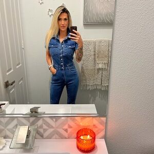 Trendy blue denim jumpsuit with button details. Perfect for casual outings.