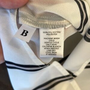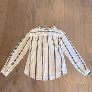 Black and off white striped blouse from LOFT. Rarely worn and in excellent condition. Two pockets at front. Faint purple stripes. Top is sheer. Size S.