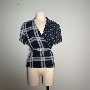 Vince Camuto Blue & White Mixed Print Wrap Blouse – Medium (NWOT)