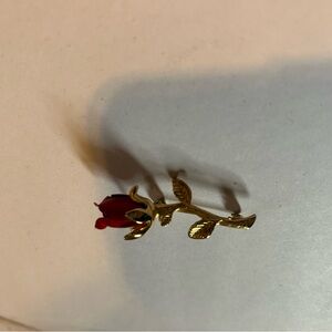 Elegant gold brooch featuring a striking red rose design. Perfect for adding a touch of sophistication to any outfit.